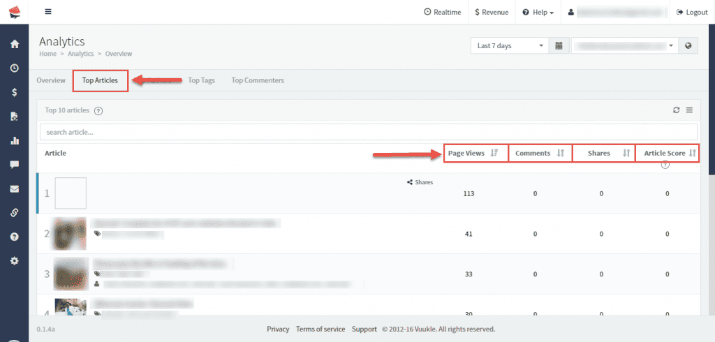Clicking on Top Articles tab, you will see your articles with most interaction. You can sort this data by article, page views, comments, shares, article score.