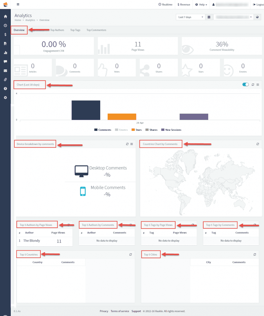 To see all overviews on one side, check Overview tab. Here you can see different statistics, like graph showing comments data in last 30% days, number of comments posted from different devices, top 5 author by page views, top 5 authors by comments, top 5 tags by page views, top 5 tags by comments, top 5 countries and top 5 cities.