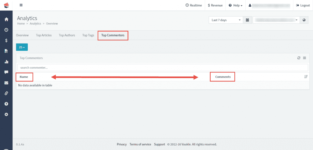 Clicking on Top Commenters tab, you will see which of your users is the most active, and with which comment. You can sort this data by commenters’ name and comment text.