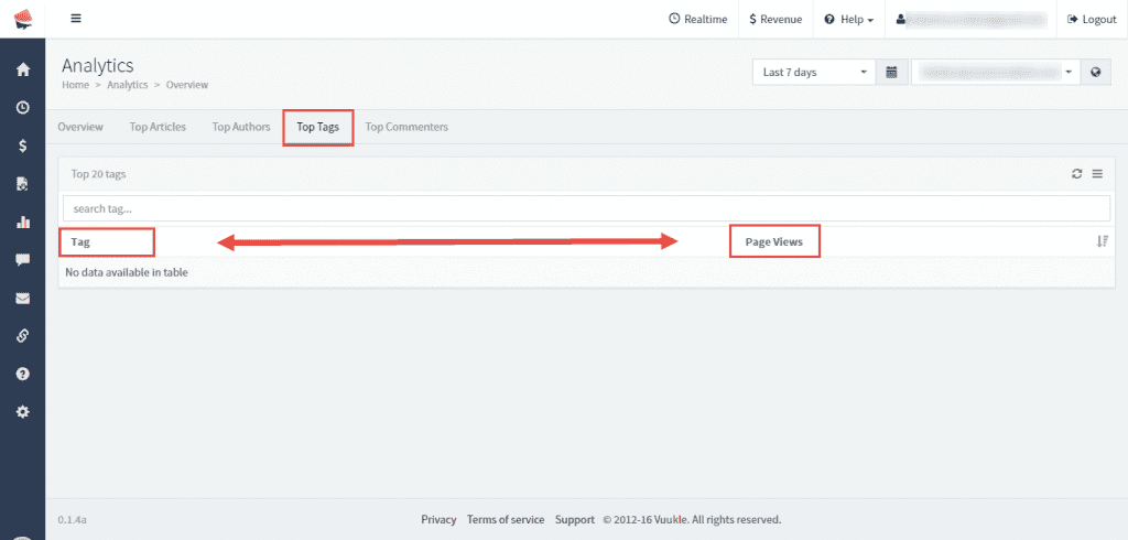 Under Top Tags tab, you can see which tag is most viewed on your site. This data can be sorted by tag name, and number of page views.