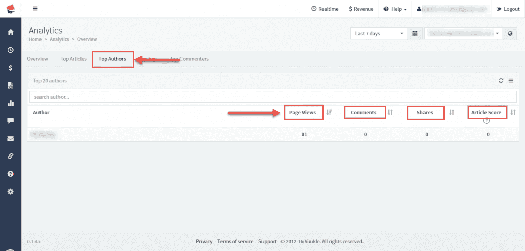 If you choose Top Authors tab, you will see which of your authors creates most visited articles. You can sort this data by page views, shares, article scores.