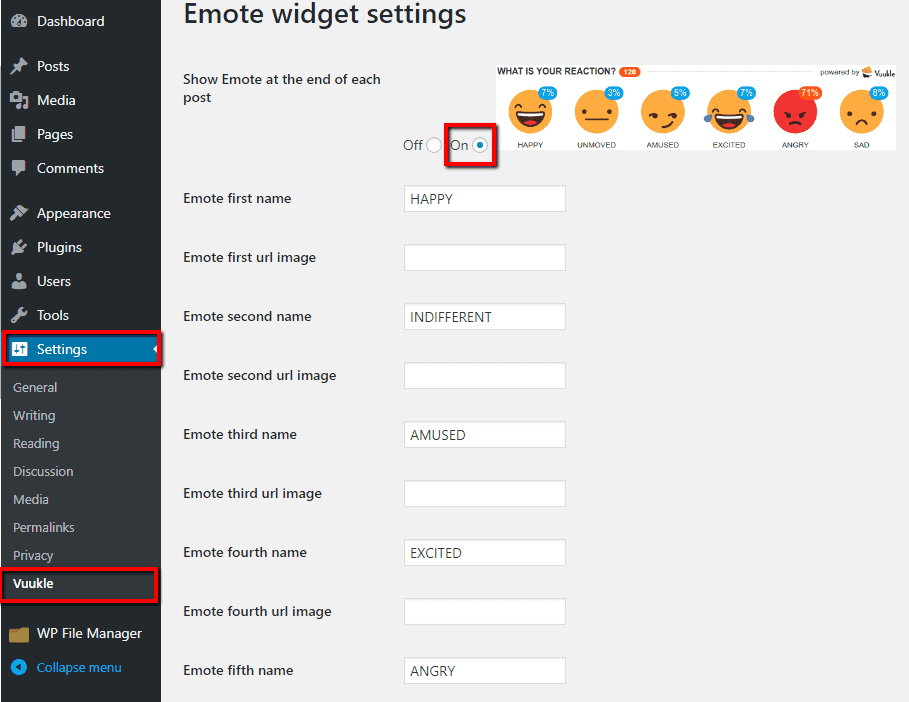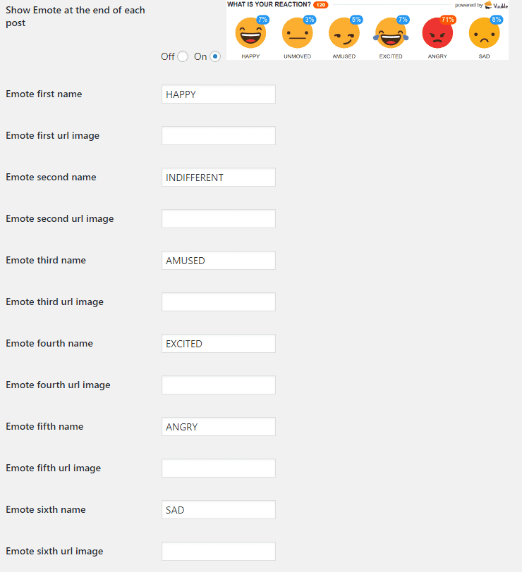 In your WordPress Admin panel, go into Settings > Vuukle and choose On for Show Emote at the end of each post option