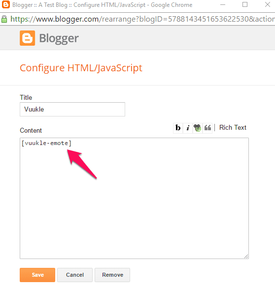 In your Blogger dashboard, go into Layout tab, edit the Vuukle HTML/JavaScript widget and insert the shortcode [vuukle-emote]. Then click the Save button.
