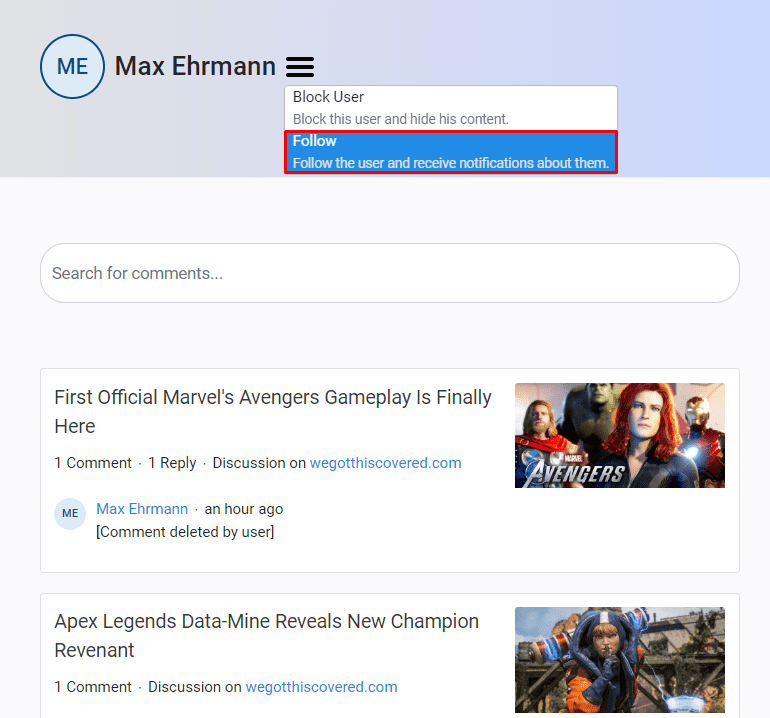 Alternatively, you can check out their profile first, then click the dropdown menu on their profile and select “Follow” from there