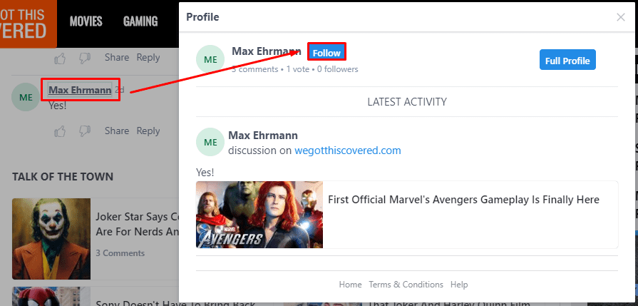 Click commenter’s name, then click “Follow” on the pop-up window