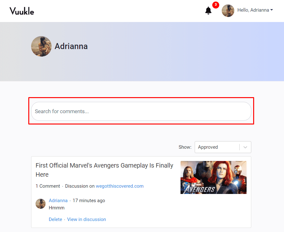 You can search comments through websites with a Vuukle comment widget or from your Vuukle account or anyone’s profile page.