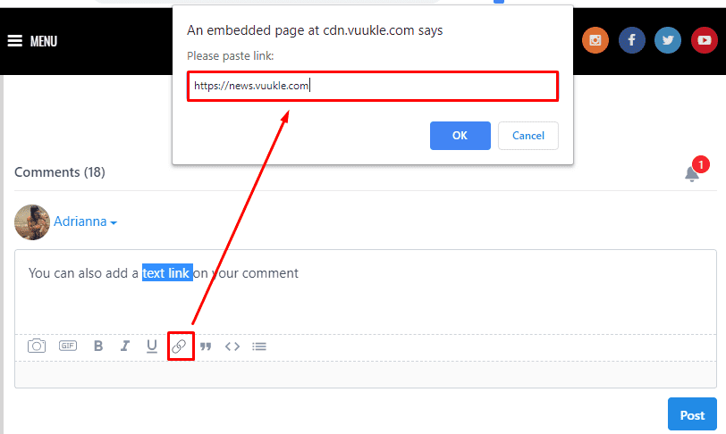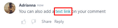 Highlight the text, then click the link icon on the comment box. Enter the URL of the page you want people to see when the text link is clicked, then click “ok”
