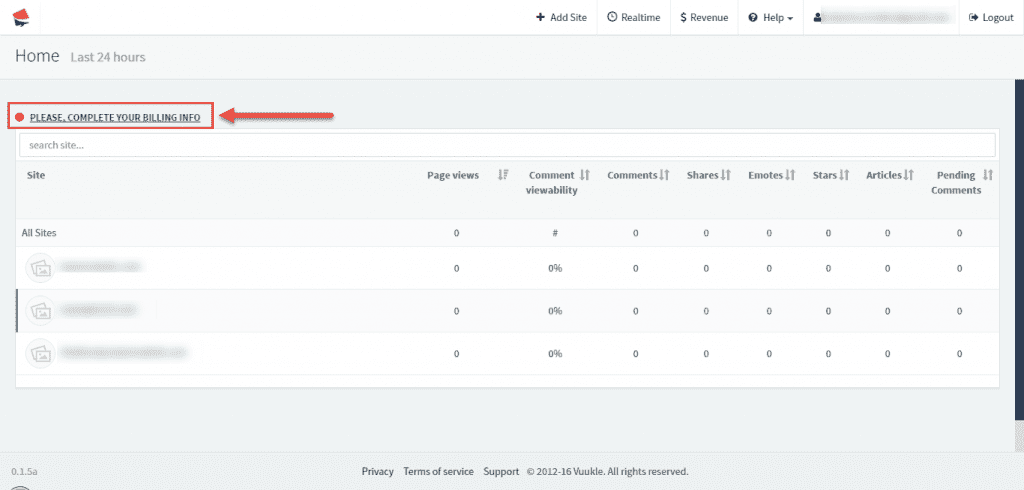 - Go to home page of your Vuukle dashboard, and click on “Please, complete your billing info” link