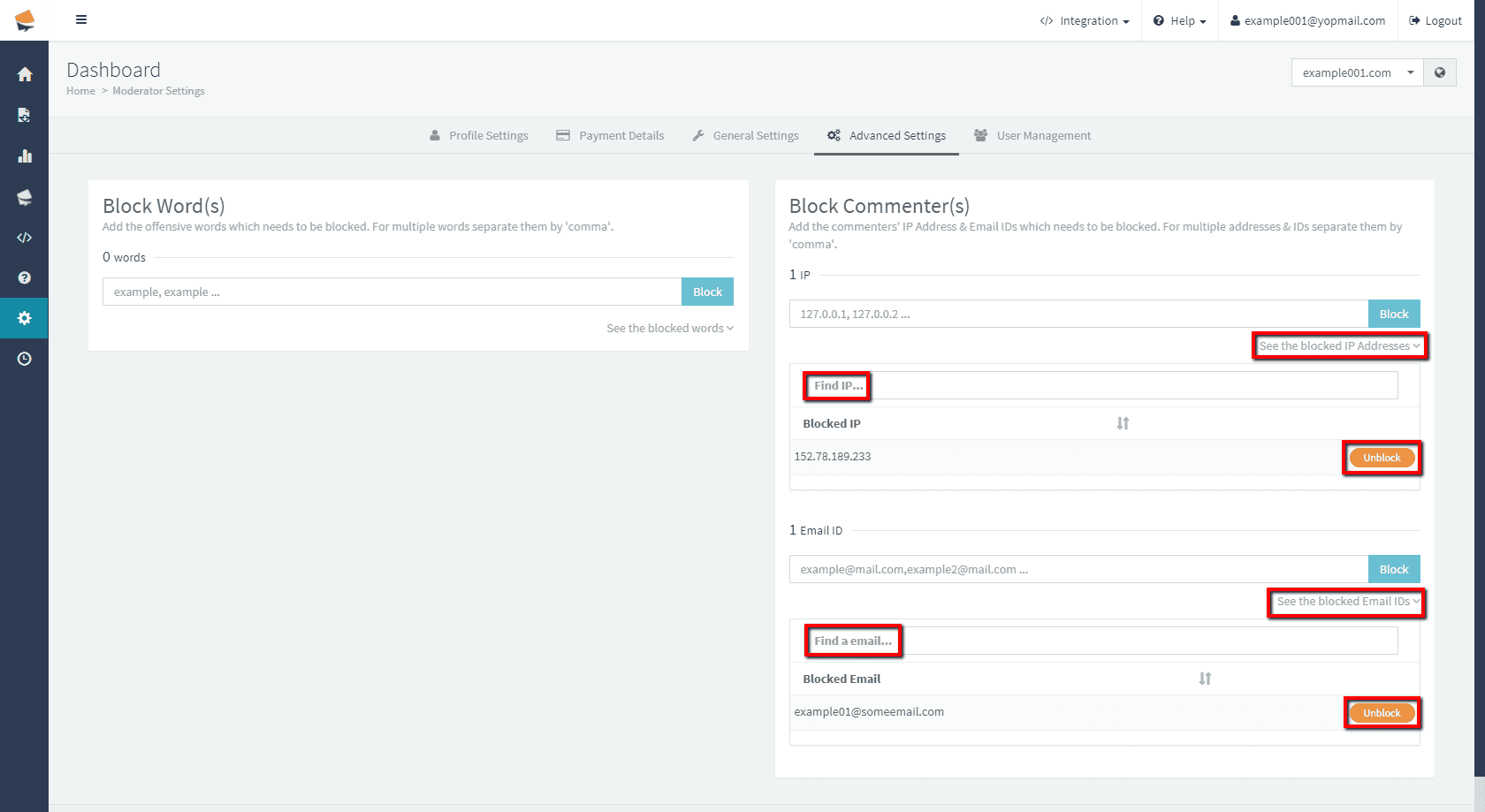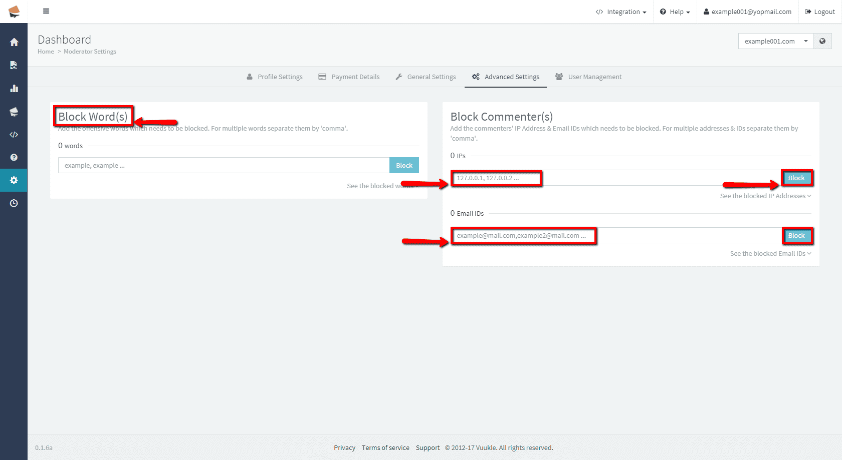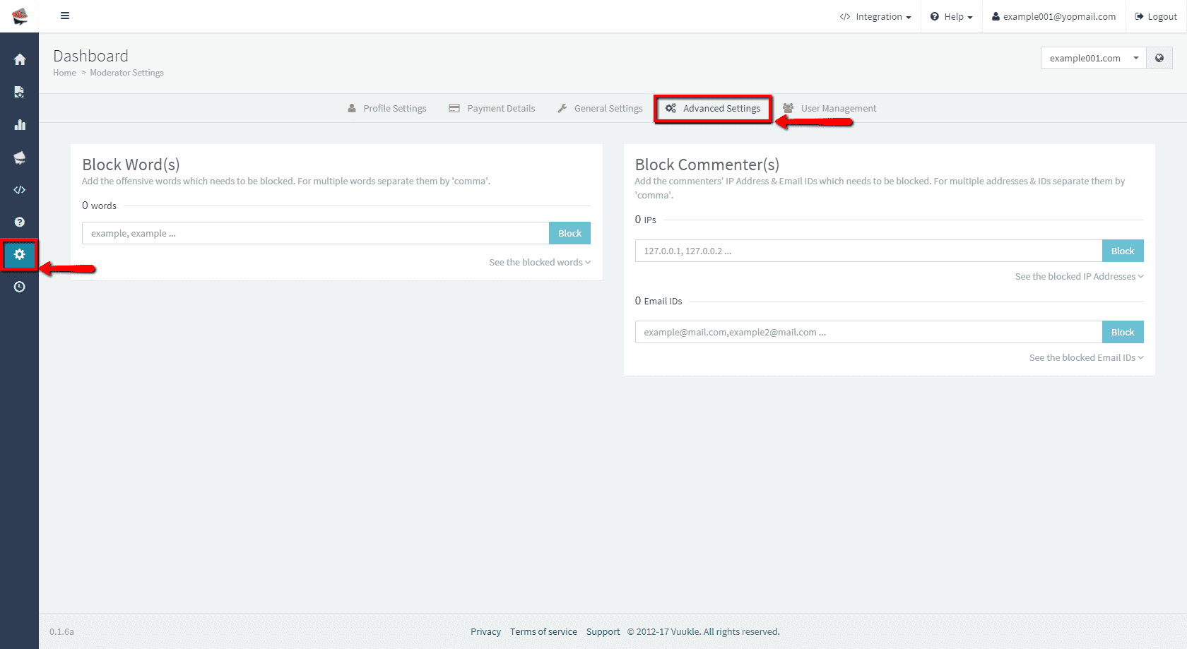 To block specific IP or email when people write comments, go to your Vuukle admin panel. Choose site on which you want to block specific ip or email. In the menu on the left, click on gear icon to select Settings. Choose Advanced Settings tab and scroll down to Block Word(s) section. Enter emails or IPs you want to block, separated with comma, and click Block. Clicking on See blocked IPs/See blocked emails, you will see list of your IPs or emails. You can search the list for specific IP or email, or delete it by clicking the ‘Unblock’ button on the right.