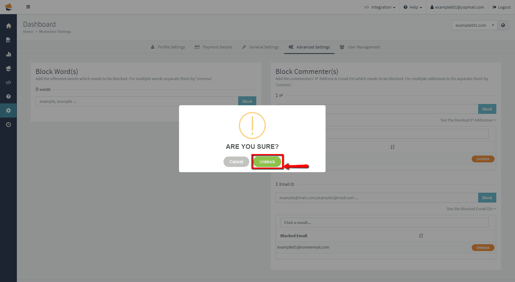 - If you choose to delete IP or email, click Unblock, delete it in confirmation window. After that you will be informed that selected it is deleted.