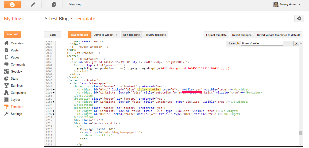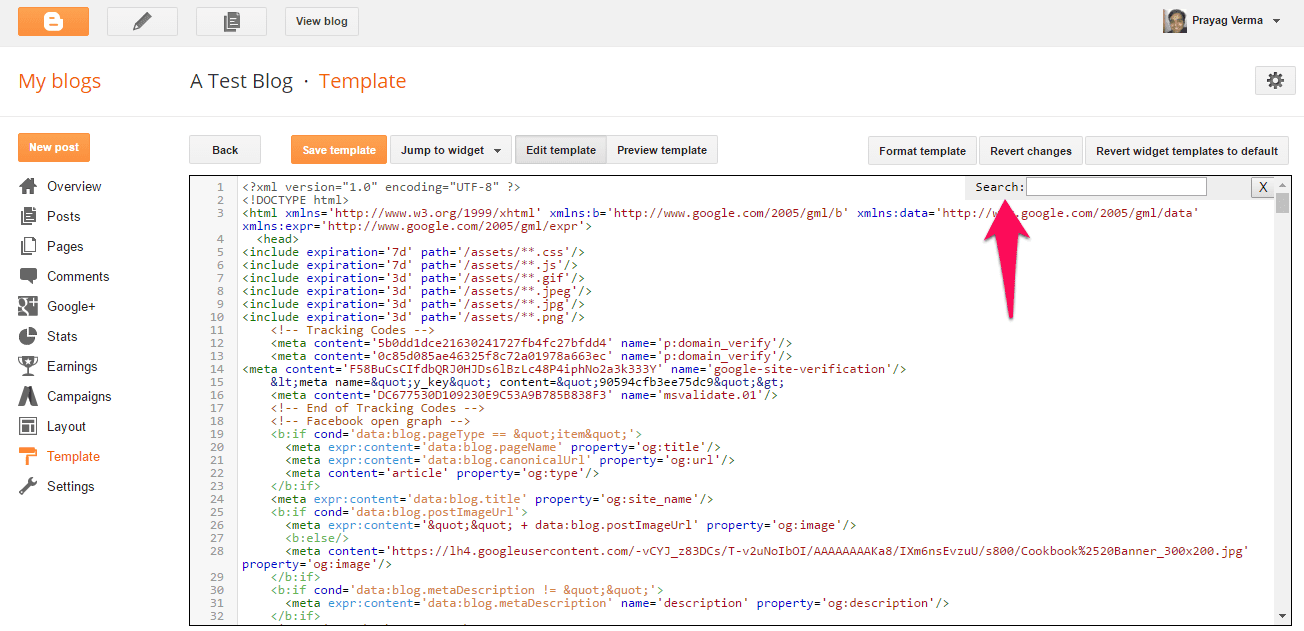 Now go into Templates tab > Edit HTML, once press inside the Template Editor area and then press CTRL+F (or Command+F if using a Mac device) and you should see a search box in the template editor at the top Right corner