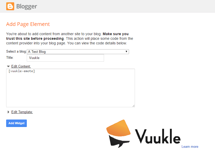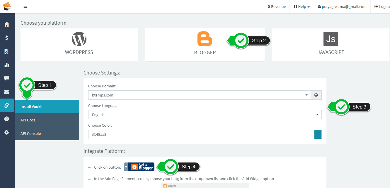 From the Vuukle Dashboard, choose the option to add the code to your Blogger blog. Do this by selecting the Chain links icon in the left sidebar, then clicking Install Vuukle, then customizing the look and feel of the widget and finally clicking on the button “Add to Blogger”