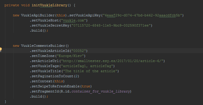 β setVuukleArticleId(ARTICLEID) β every article have unique Article ID β setTimeZone(TIMEZONE) β set your timezone. https://en.wikipedia.org/wiki/List_of_tz_database_time_zones β setVuukleUrl(URL) β URL for your article (you will be able to share this link to facebook or to twitter) β setVuukleTagsTags(TAGS) Tags β You need to paste tags separated by comma for each article(like you have on website/domain), β setTopArticle(true) it will show top articles below the comments β setVuukleTitle(TITLE) same for TITLE β the title of the article on which library is now. β setPaginationToCount(paginationToCount) β this field in not required. You can set how many comments will be downloaded per one request. By default 10. β setContext(this) β put context; β setFragmentId(R.id.container) β Set fragment id from your .xml in which you want to put all comments