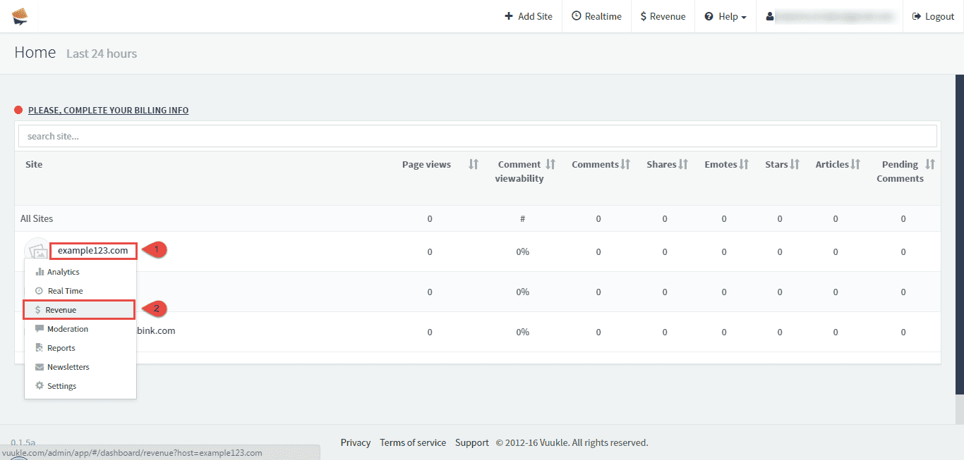 - Go to home page of your Vuukle account, choose site, and click on Revenue on submenu.