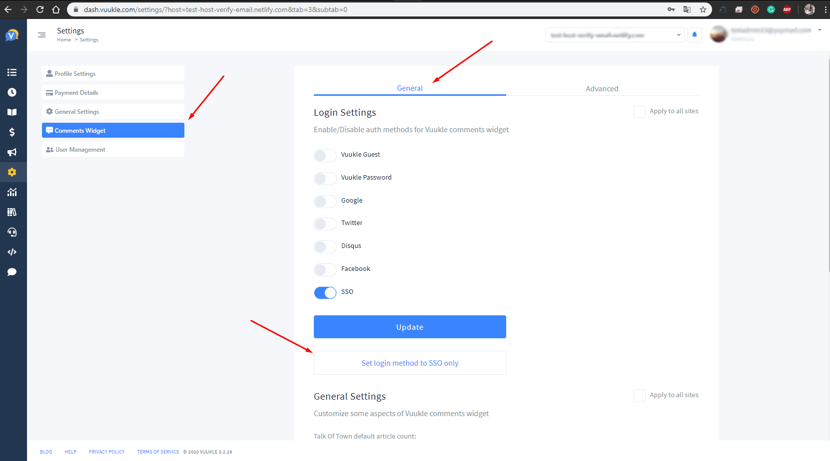 Also you need to set the SSO login type by using our dashboard. To do this you need to move to the “Moderation” page, open “Comments Widget” tab -> General and click on the “Set login method to SSO only” button