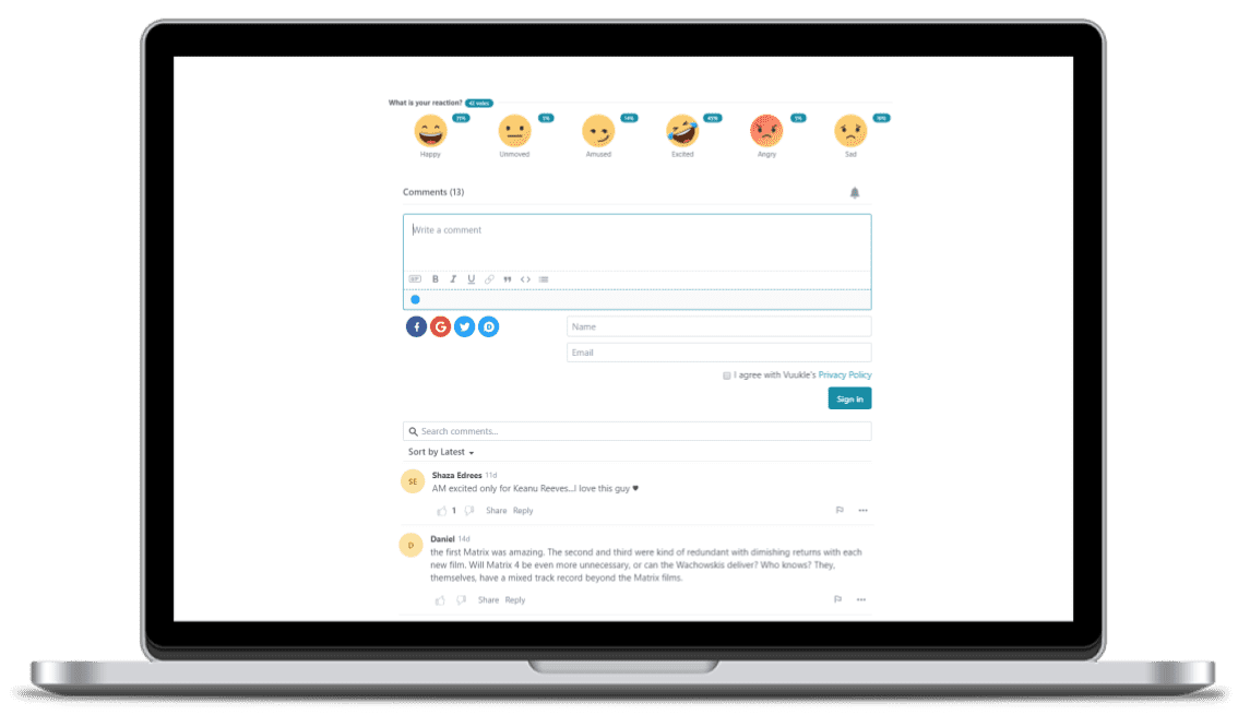 Vuukle is world’s top custom user engagement and commenting platform for enterprise sites and blogs. Using it you can increase user engagement, increase traffic and increase website revenue.