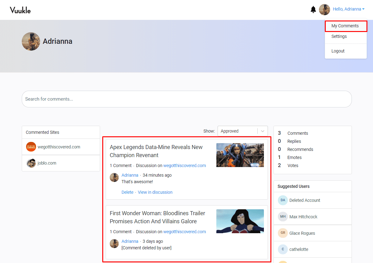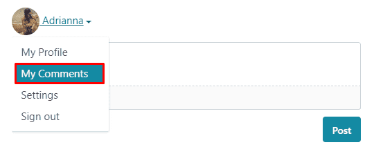 - Select “My Comments” from the avatar dropdown at the top right corner of the page
