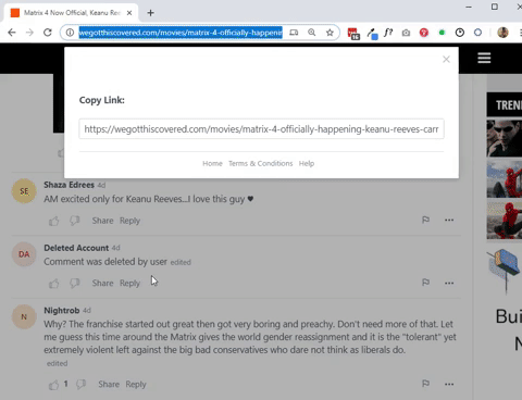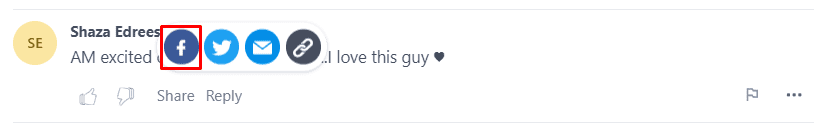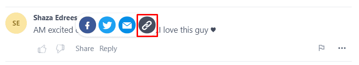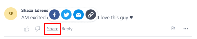 You can share your own or someone else’s comment on Facebook, Twitter, Email, or simply copy the comment URL